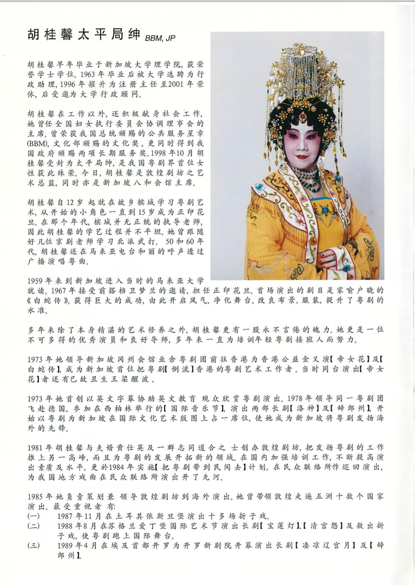 Mrs Joanna Wong Quee Heng (胡桂馨)is a well-known name and face in Singapore, not only for her contributions to the arts, but also for her professional achievements and community service. She is the first traditional Chinese opera artist to be awarded the Cultural Medallion by the Singapore government, in 1981. Born in Penang in 1939 where she started learning opera at the age of 12, she moved to Singapore to pursue her studies at the University of Singapore where she obtained a Bachelor of Honours degree in Science. At university, she was the first female student to win the gold medal for being the best all round student.